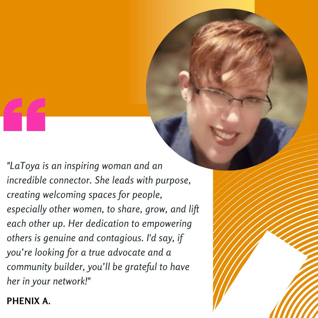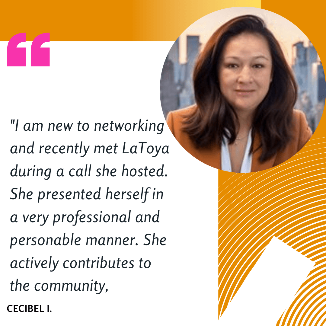 "LaToya is a powerhouse networker, passionate about connecting the right people to the right resources. Love her energy and dedication. You must meet her!"